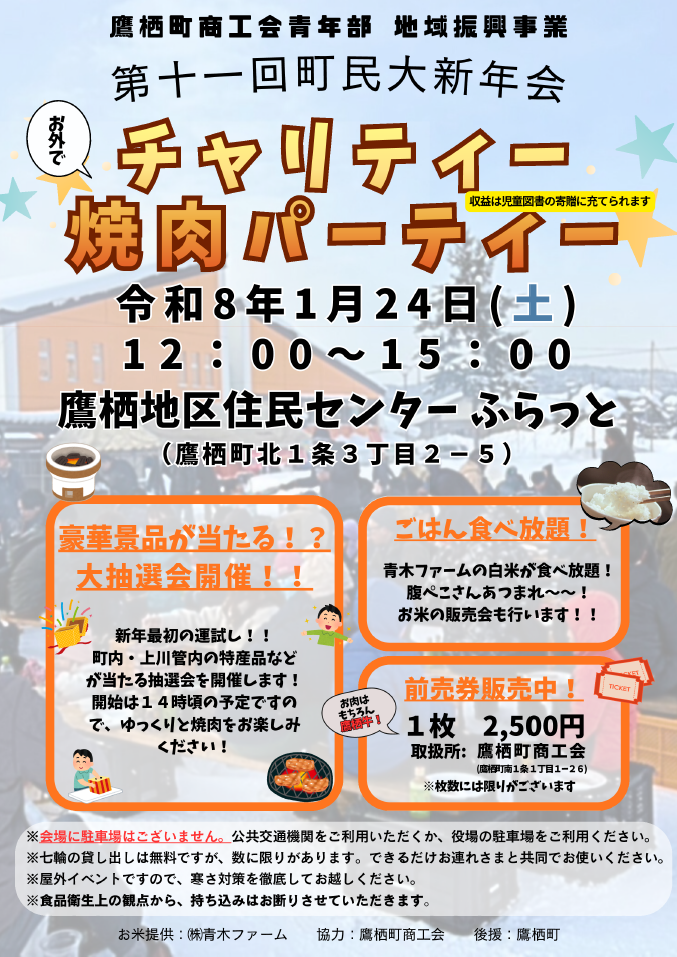 今年も鷹栖町商工会青年部主催「第11回町民大新年会チャリティー焼肉パーティー」が行われます。また豪華景品が当たる大抽選会も開催されます。